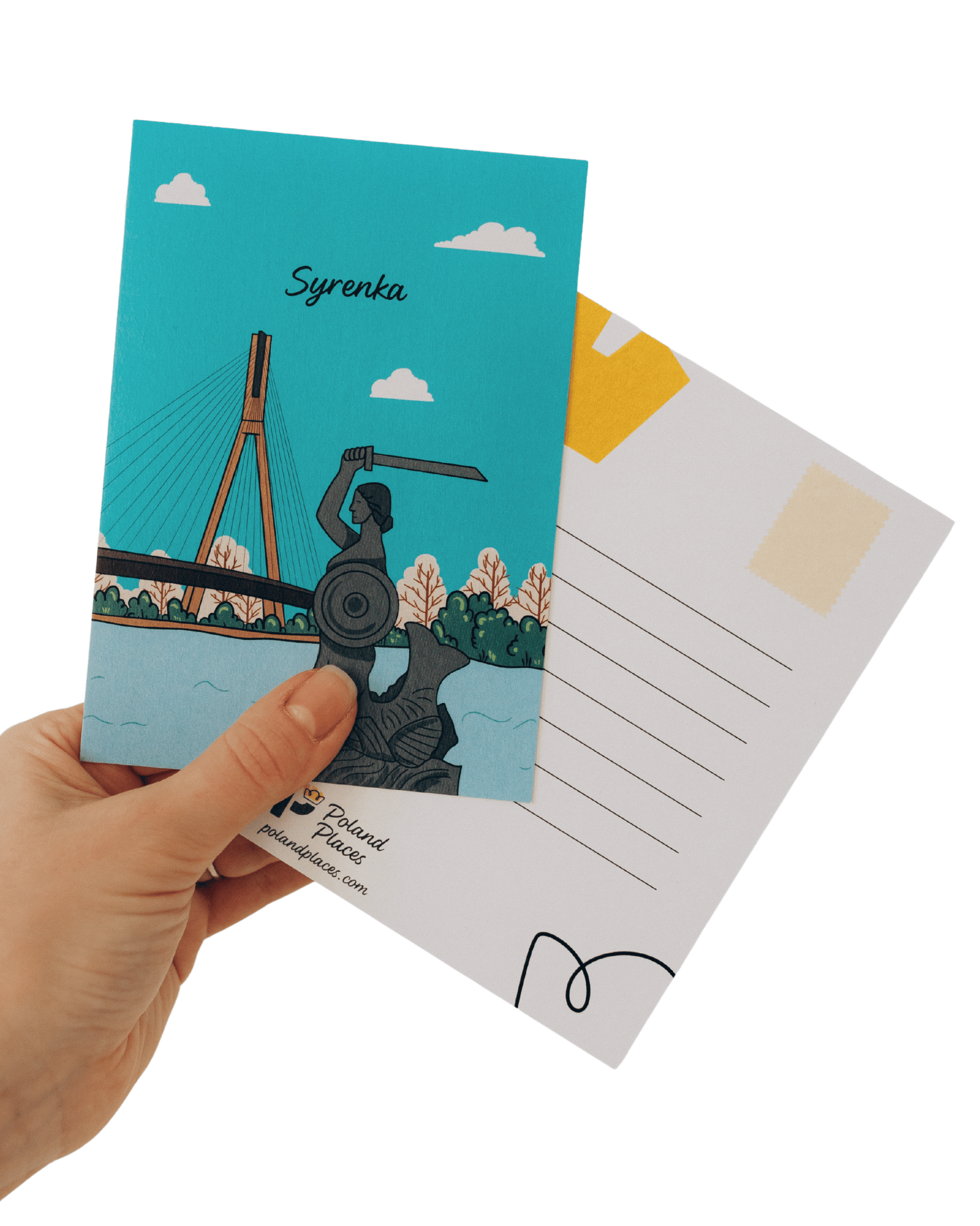 The Mermaid postcard features the iconic mermaid from Warsaw, set against the Vistula River with a backdrop of the Świętokrzyski bridge and turquoise sky. There’s space on the back for a postal stamp and your message, ready to send a piece of Warsaw's charm and legend from Poland!