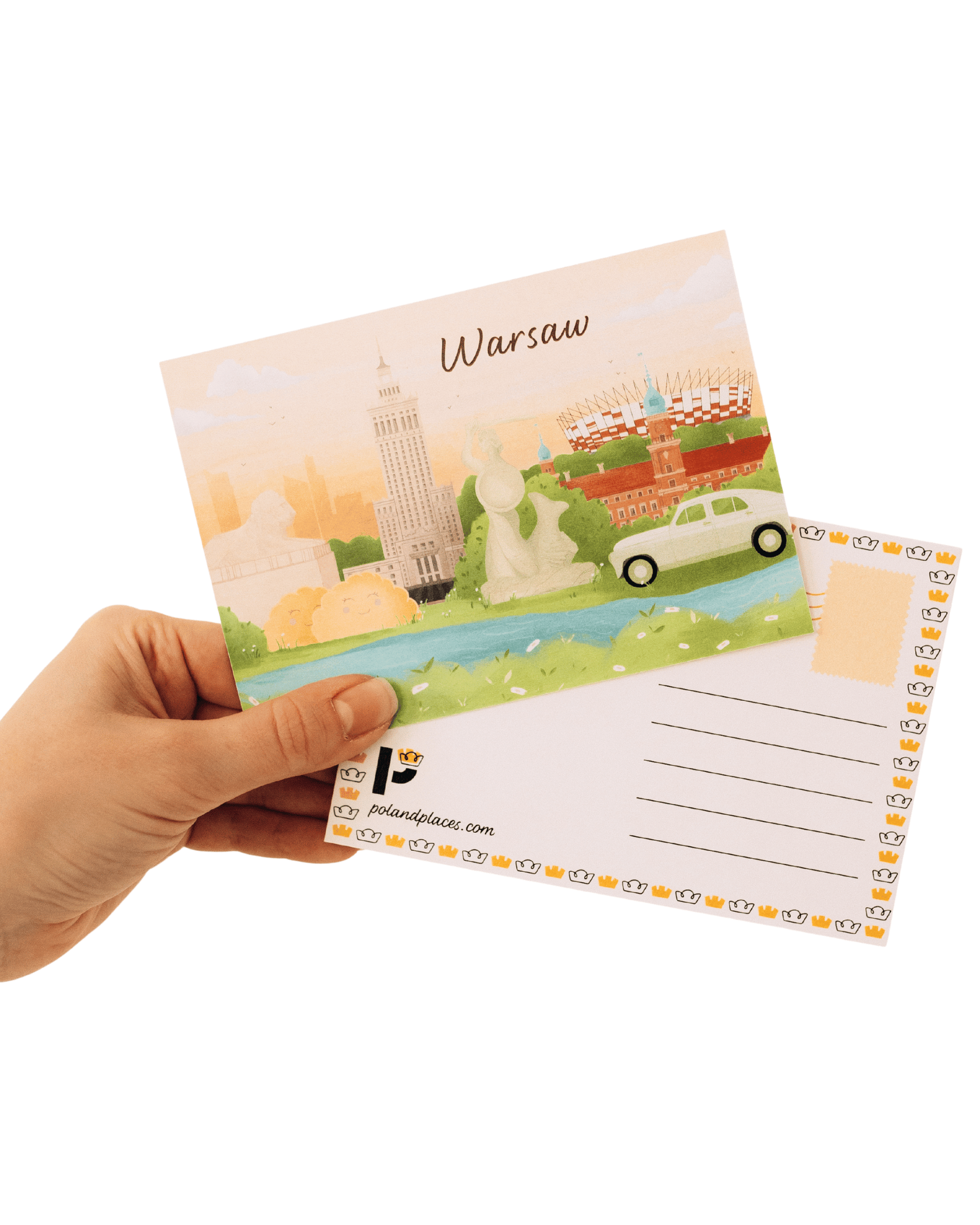 The Warsaw Postcard showcases all the city's iconic symbols in one place: the Palace of Culture and Science, the National Stadium, the lion monument from in front of the Presidential Palace, the Warsaw Mermaid, the Warszawa car, and pierogi. It has space for a postal stamp and your message on the back, ready to carry your greetings from the most beautiful corners of Warsaw.