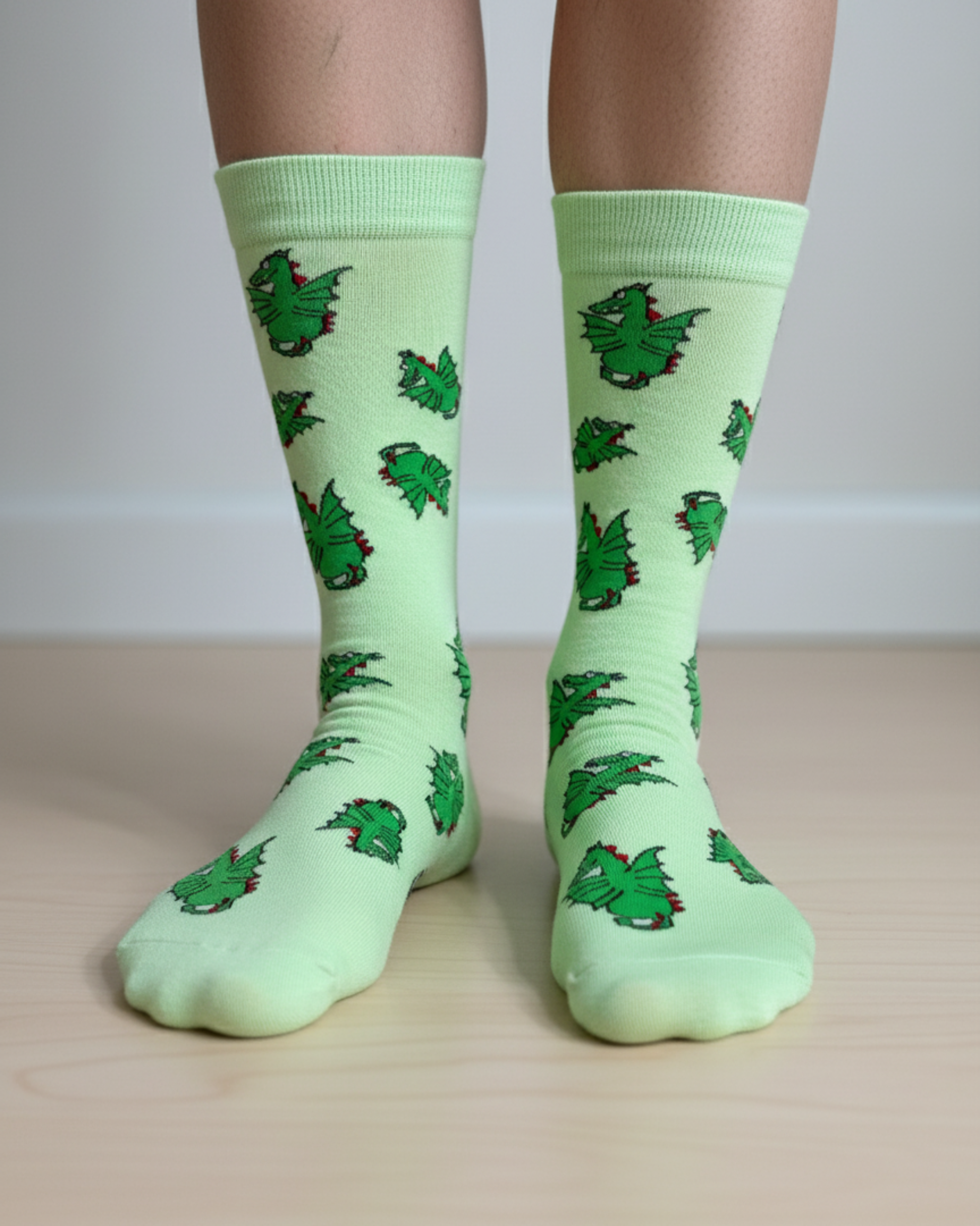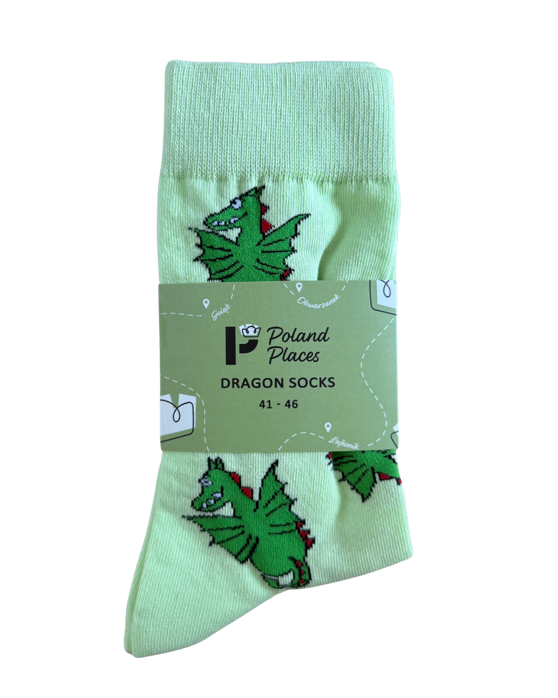 Nasze zielone skarpetki ze smokami wawelskimi to wyjątkowy dodatek, który łączy wygodę z odrobiną legendy! Idealne jako pamiątka z Polski, prezent z humorem lub po prostu codzienny akcent, który poprawia nastrój.